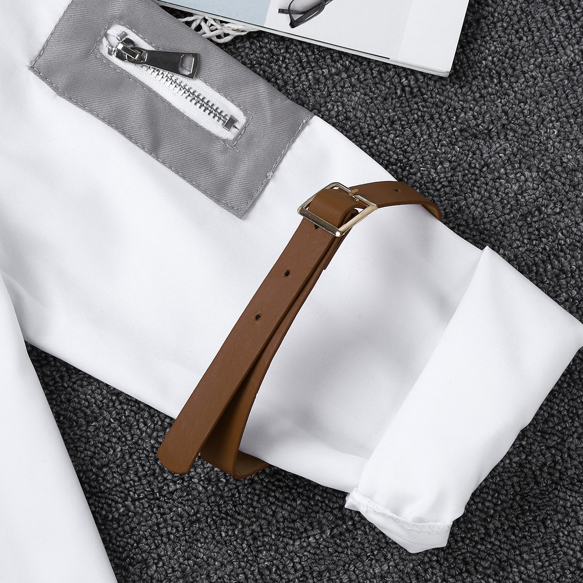 Maniche lunghe, polsini con bottoni, risvolti, due tasche finte nella parte superiore, toppa sul braccio sinistro, bottone frontale.